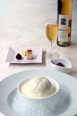 For our dessert choices, my friends ordered the Hot Apple Soup with Caramel ice cream and Sweet Potato Creme Brulee, while I ordered the Fromage Blanc Island "Cheese Cake" (see below). Everyone loved their desserts and I especially liked mine. It was a mousse made of cheese that was incredibly light and yet still had the same flavor satisfaction you get from a very rich cheesecake. Served with some cream on a bed of shaved ice. If you go, I definitely recommend that someone in your party order it.